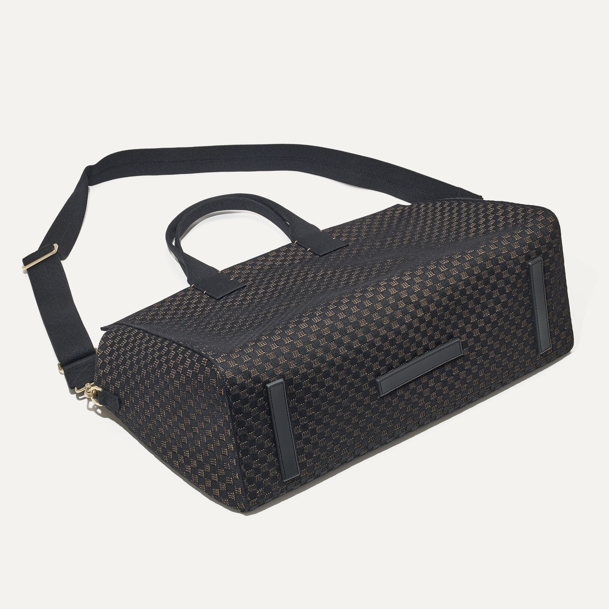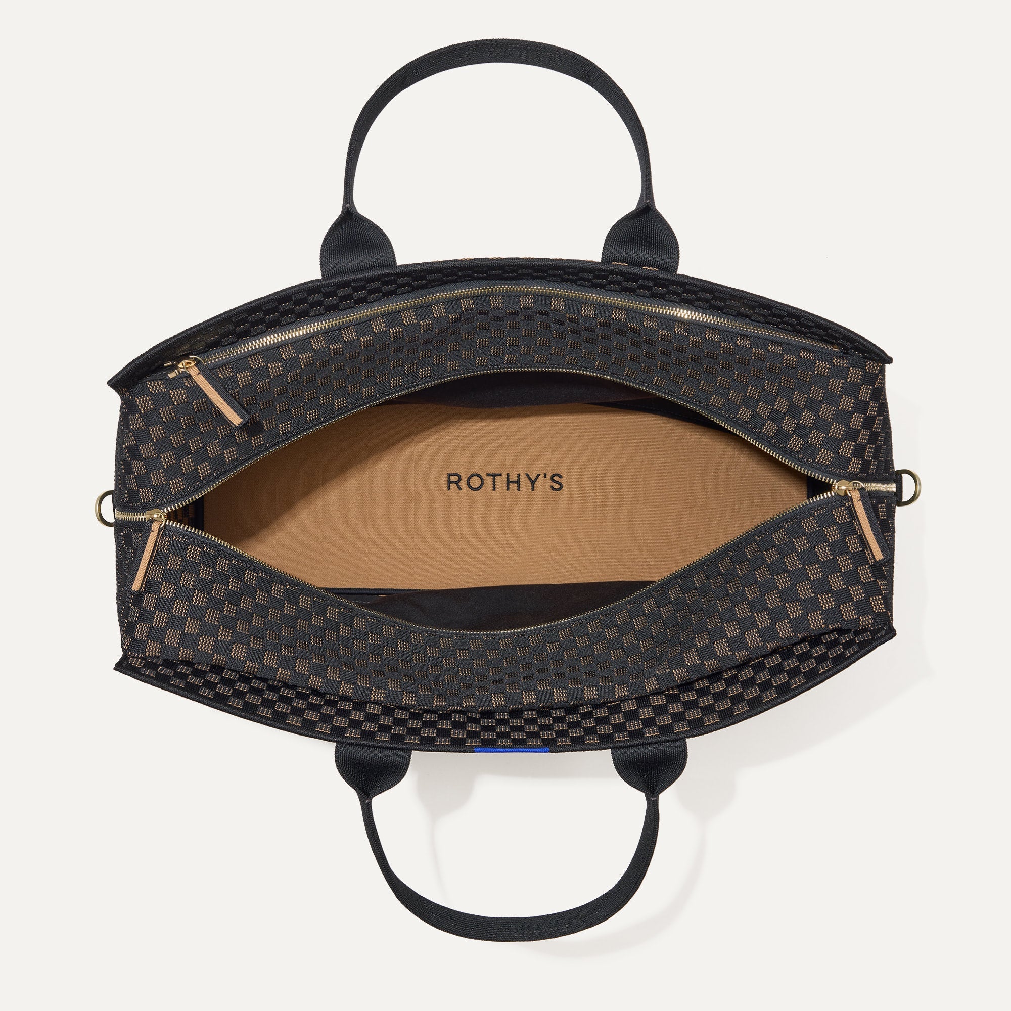 - Structured design in a black and camel basketweave pattern. with a double-zipper top closure and durable bag feet.