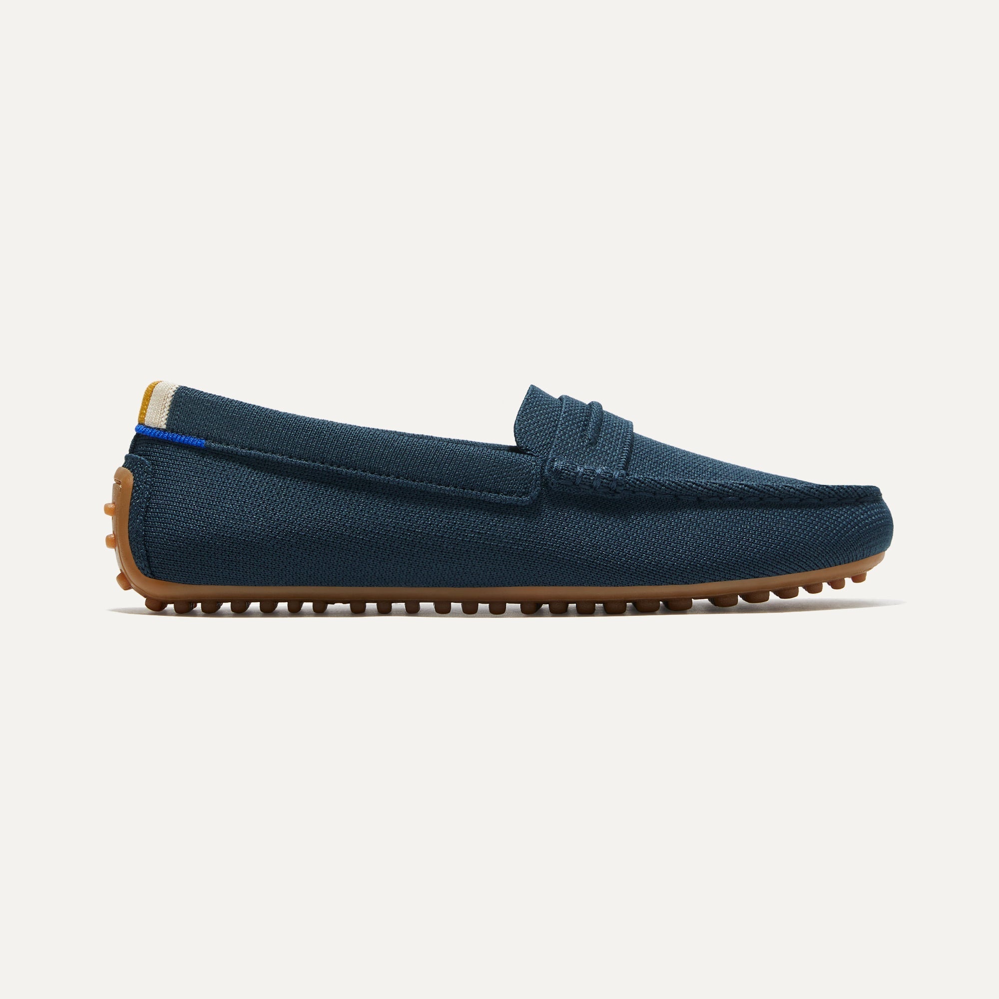 - A tonal cream and honey stripe graces the heel of the shoe.