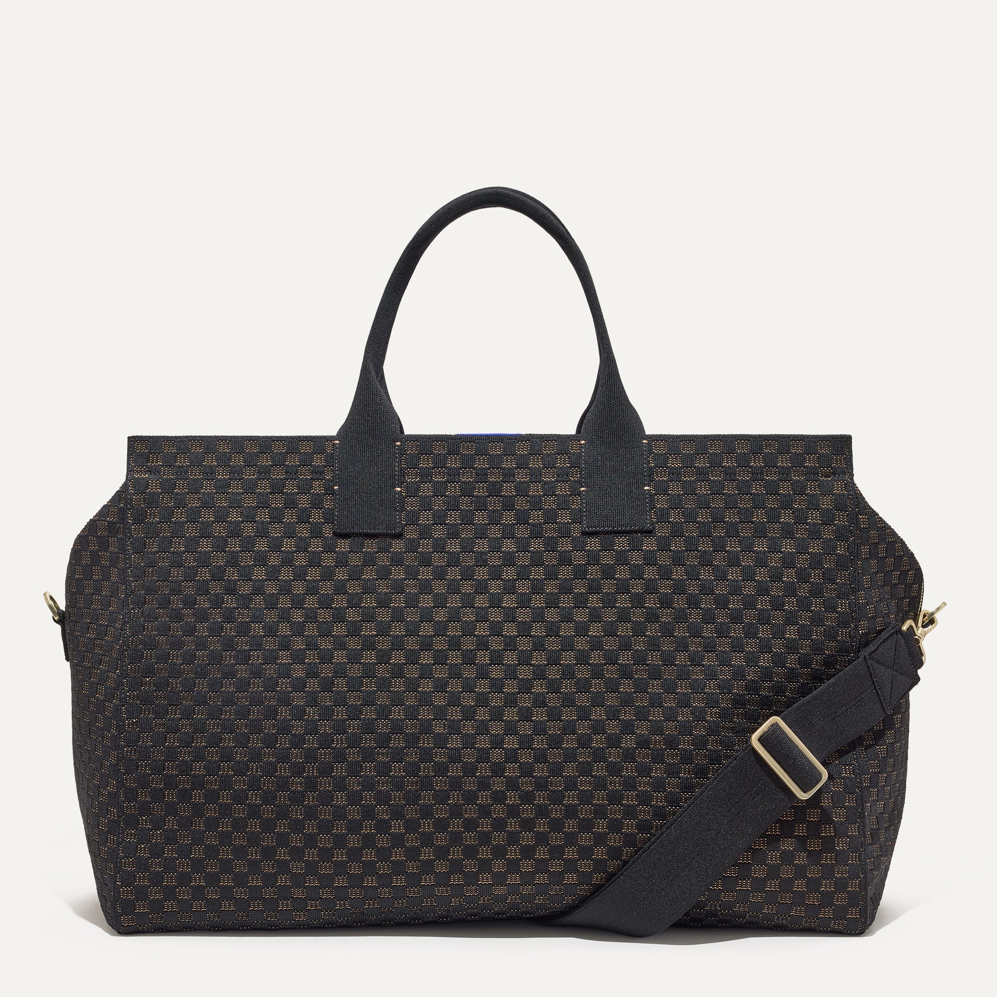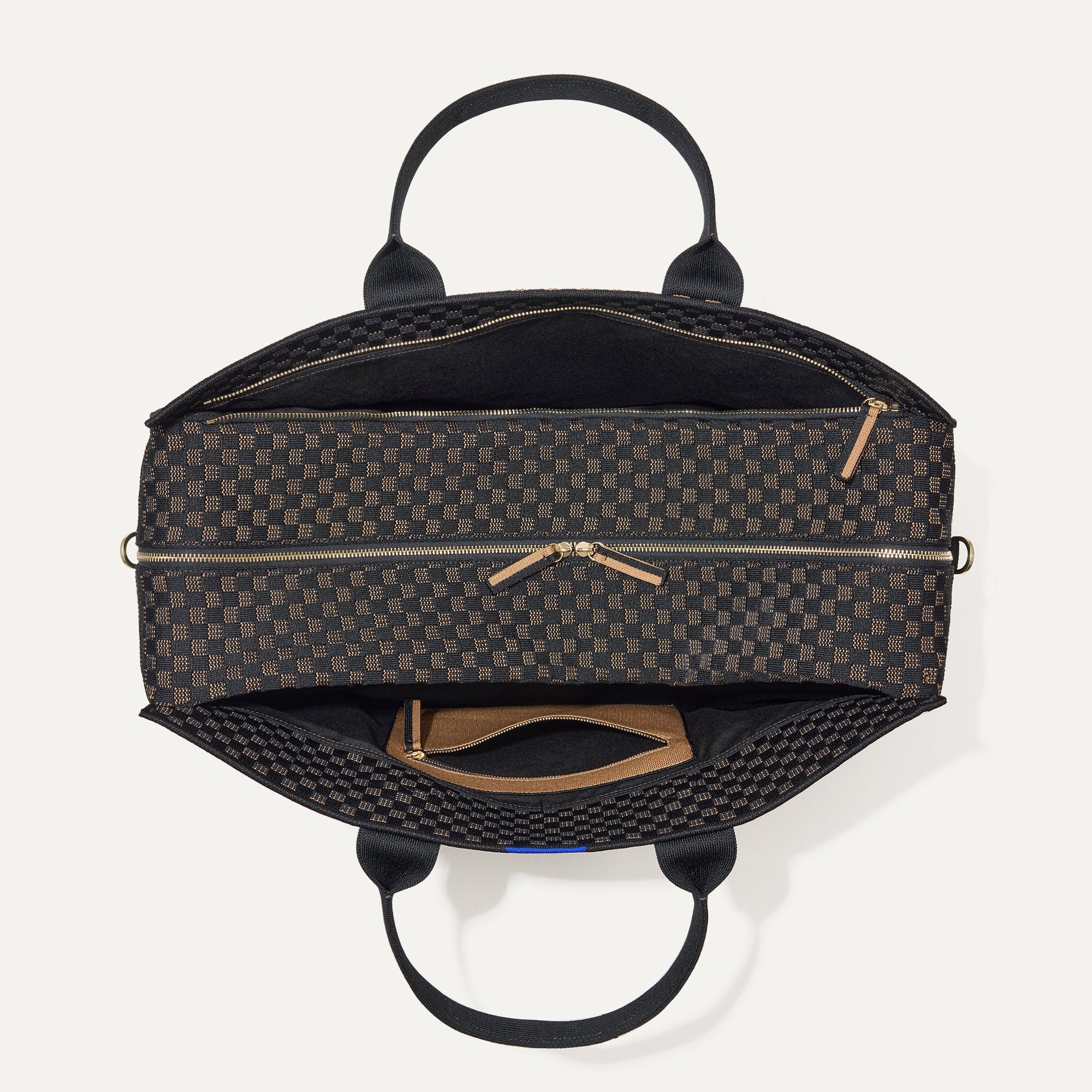 - Structured design in a black and camel basketweave pattern. with a double-zipper top closure and durable bag feet.
